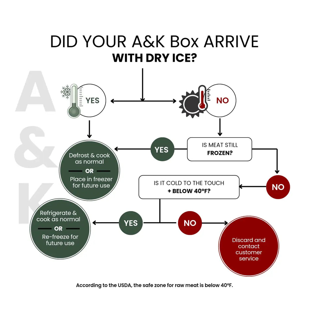 All perishable orders ship once weekly on Mondays. To be included in Monday’s shipment, orders must be placed by Sunday at 7:00 PM CST. Pickup is also available at A&K Land & Cattle, with most orders ready within 24 hours